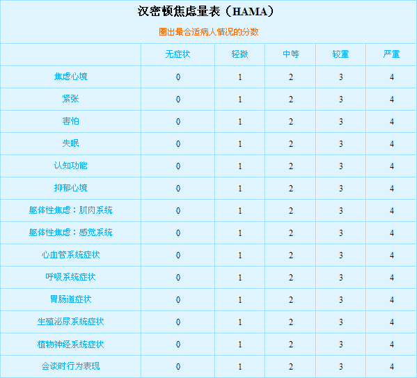 汉密顿量表(HAMA):由Hamilton(汉密顿)于1959年编制,包括14个项目,每项分5级评定,为经典的焦虑评定量表。总分超过29分,可能为严重焦虑;超过21分,肯定有明显焦虑;超过14分,肯定有焦虑;超过7分,可能有焦虑;小于7分,为无焦虑,一般取14分为焦虑分界值。量表又分出躯体性、精神性两项因子分,可进一步了解病人的焦虑特点。
